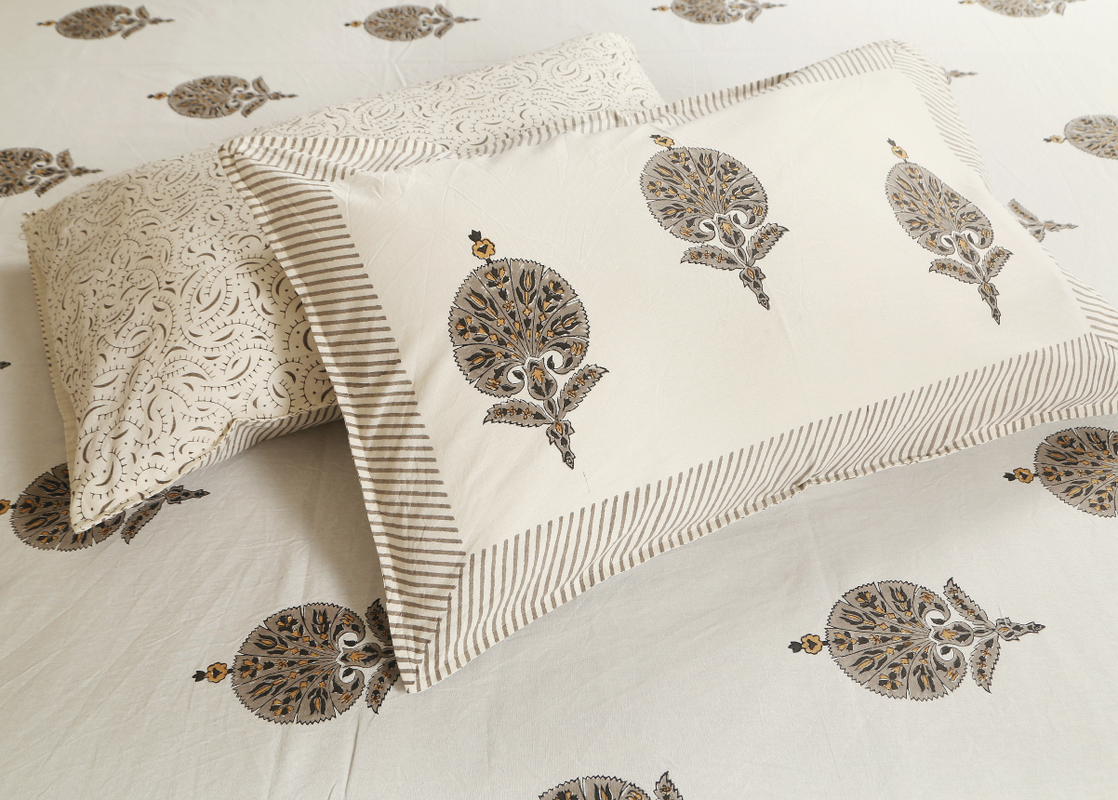 Hand Block Printed Cotton Bedsheet with 2 Pillow Cover – Rajwada buta grey